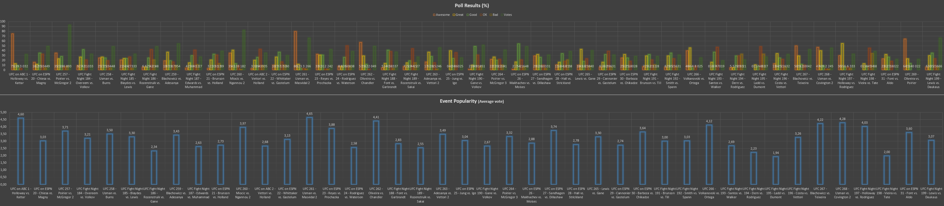 2021 polls chart (CLICK TO ENLARGE) Top list of the most popular events "ever" (since we started polling in October 2019) is currently: 1. UFC 261 - Usman vs. Masvidal 2 [Awesome][4.65] 2. UFC on ABC 1 - Holloway vs. Kattar [Awesome][4.60] 3. UFC on ESPN 12 - Poirier vs. Hooker [Awesome][4.54] 3. UFC 269 - Oliveira vs. Poirier [Awesome][4.54] 4. UFC 262 - Oliveira vs. Chandler [Awesome][4.41] 5. UFC 249 - Ferguson vs. Gaethje [Awesome][4.38] 6. UFC 268 - Usman vs. Covington 2 [Awesome][4.28] 7. UFC Fight Night 179 - Moraes vs. Sandhagen [Awesome][4.26] 8. UFC 256 - Figueiredo vs. Moreno [Awesome][4.24] 9. UFC 267 - Blachowicz vs. Teixeira [Awesome][4.22] 10. UFC 254 - Khabib vs. Gaethje [Awesome][4.18] 11. UFC 266 - Volkanovski vs. Ortega [Awesome][4.12] 12. UFC 245 - Usman vs. Covington [Awesome][4.04] 13. UFC Fight Night 197 - Holloway vs. Rodriguez [Great][4.03] 14. UFC 244 - Masvidal vs. Diaz [Great][4.00] 15. UFC on ESPN 14 - Whittaker vs. Till [Great][3.99] 16. UFC 260 - Miocic vs. Ngannou 2 [Great][3.97] Top list of the least popular events so far is:1. UFC Fight Night 195 - Ladd vs. Dumont [Ok][1.94] 2. UFC Fight Night 198 - Vieira vs. Tate [Ok][2.00] 3. UFC Fight Night 194 - Dern vs. Rodriguez [Bad][2.23] 4. UFC Fight Night 164 - Blachowicz vs. Jacare [Ok][2.25] 5. UFC on ESPN 10 - Eye vs. Calvillo [Ok][2.28] 6. UFC Fight Night 186 - Rozenstruik vs. Gane [Ok][2.34] 7. UFC Fight Night 189 - Rozenstruik vs. Sakai [Ok][2.55] 8. UFC Fight Night 175 - Smith vs. Rakic [Good][2.56] 9. UFC on ESPN 11 - Blaydes vs. Volkov [Ok][2.57] 10. UFC on ESPN 24 - Rodriguez vs. Waterson [Ok][2.58] 11. UFC 248 - Adesanya vs. Romero [Bad][2.59] 2021 Polls are done, don't forget to vote in the polls in 2022 as well!